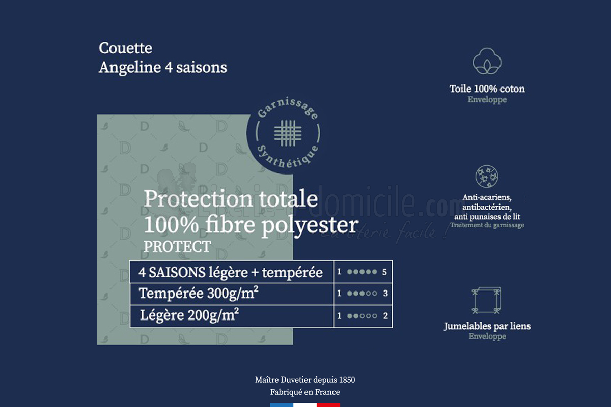 La couette synthétique ANGELINE v.3 répond à toutes vos exigences de durabilité et d'hygiène. Son garnissage anti-acarien et anti-bactérien, associé à une enveloppe traitée anti-punaises de lit vous assure une protection totale. La version 4 saisons est composée d'une couette ANGELINE été 200 g + une couette ANGELINE tempérée 300 g. Ces couettes sont jumelables par liens et restent utilisables indépendamment. Pratique pour recevoir la famille ou les amis !
