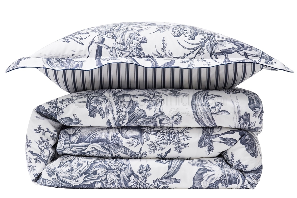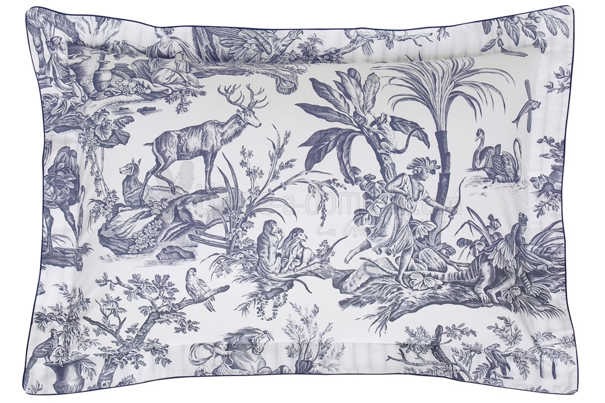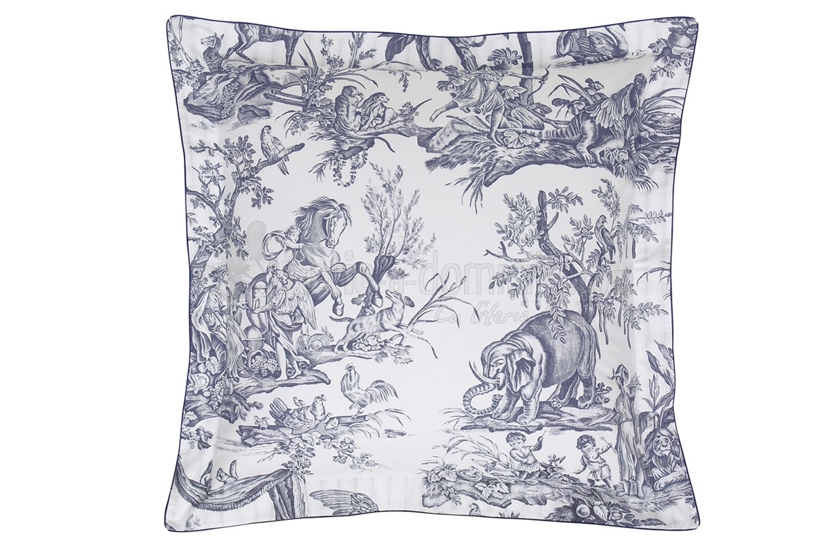 - taie d'oreiller carrée et rectangulaire : recto imprimé motif représentant divers animaux, personnages et paysages du monde façon toile de Jouy bleu sur fond blanc, verso imprimé rayures bleues dans les tons sur fond blanc, finition passepoil bleu, volant plat de 4,5 cm, simple rabat, taie sac