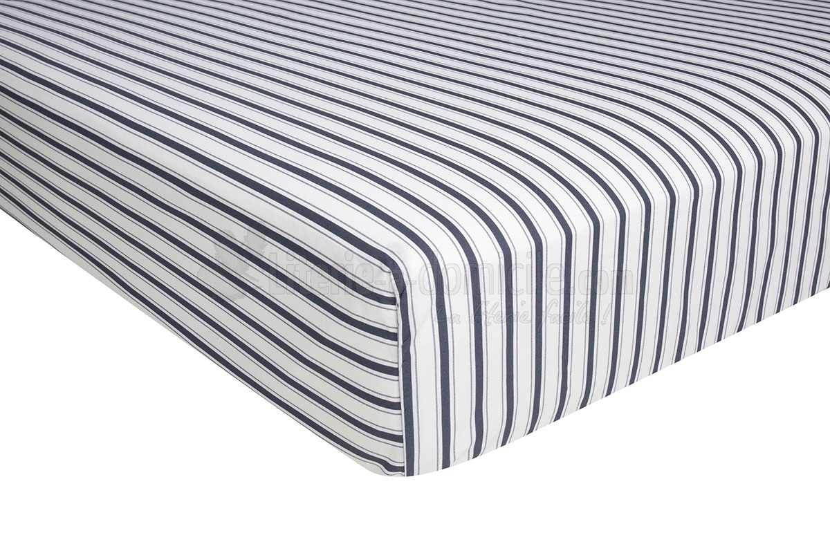 - drap housse : coordonné, imprimé rayures bleues dans les tons sur fond blanc, bonnets de 35 cm, finition biais uni assorti
