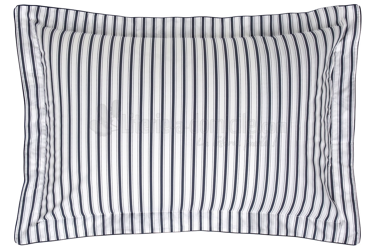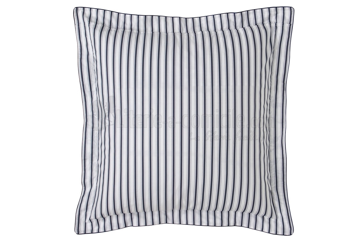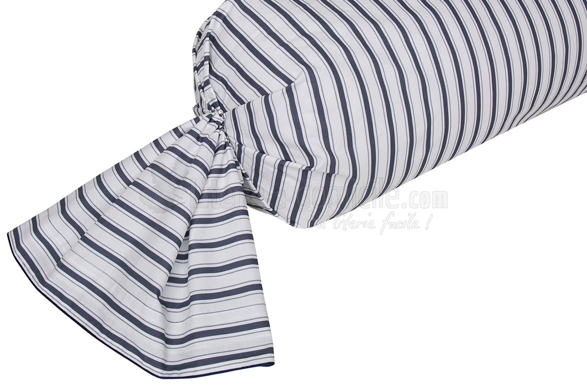 - taie de traversin : forme fourreau, imprimé rayures bleues dans les tons sur fond blanc, finition passepoil gris
