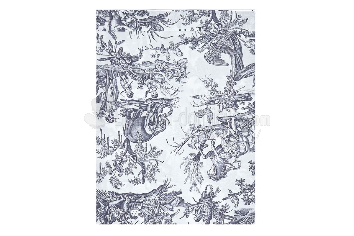 - drap plat : imprimé motif représentant divers animaux, personnages et paysages du monde façon toile de Jouy bleu sur fond blanc, parement de 8 cm, finition passepoil bleu