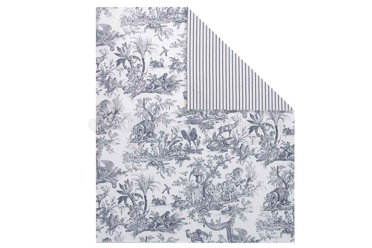 - housse de couette : recto imprimé motif représentant divers animaux, personnages et paysages du monde façon toile de Jouy bleu sur fond blanc, verso imprimé rayures bleues dans les tons sur fond blanc, finition bouteille