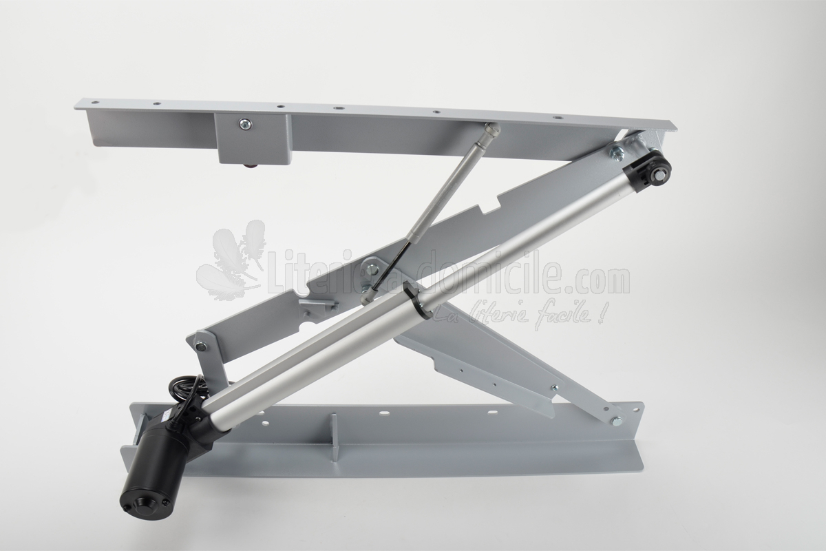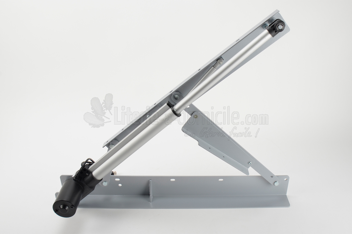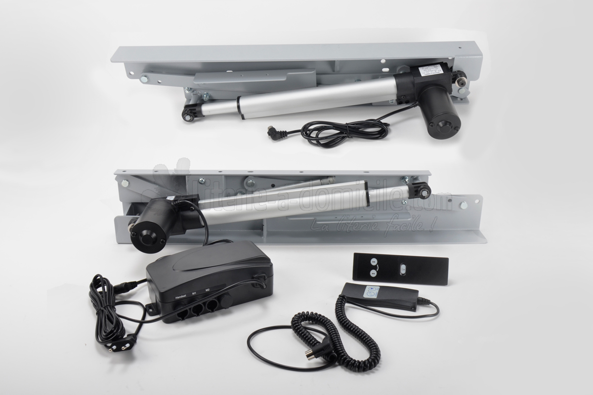 CTCMDA comporte 2 côtés motorisés ainsi qu'un verin à gaz par côté qui amortit le passage de la position horizontale haute à celle de l'ouverture du coffre.. Cette version est adaptée aux sommiers-coffres de grandes dimensions y compris 200 x 200 et pour literie lourde.