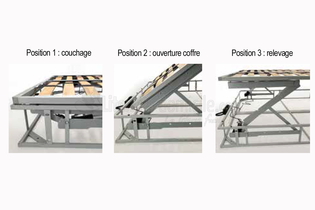 Le système de relevage électrique CTCMDA DOUBLE POSITION permet, en plus d'un accès au lit coffre, de relever son sommier sans effort en position horizontale. Ce réhaussement permet de faire son lit sans se baisser !