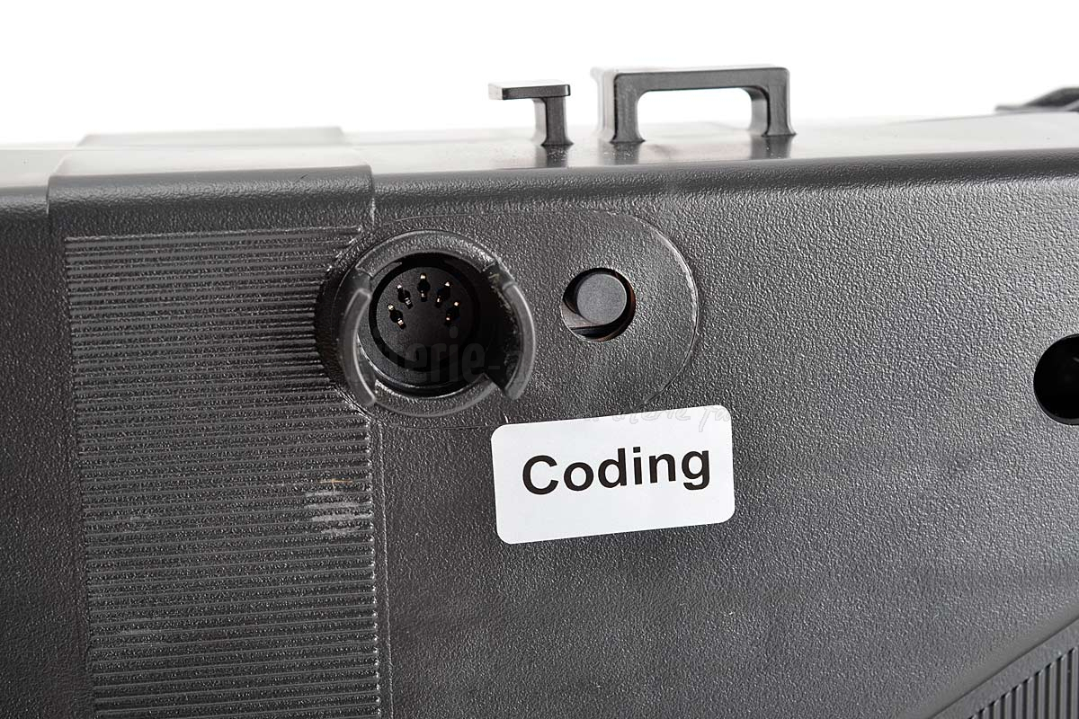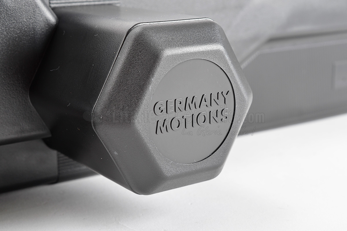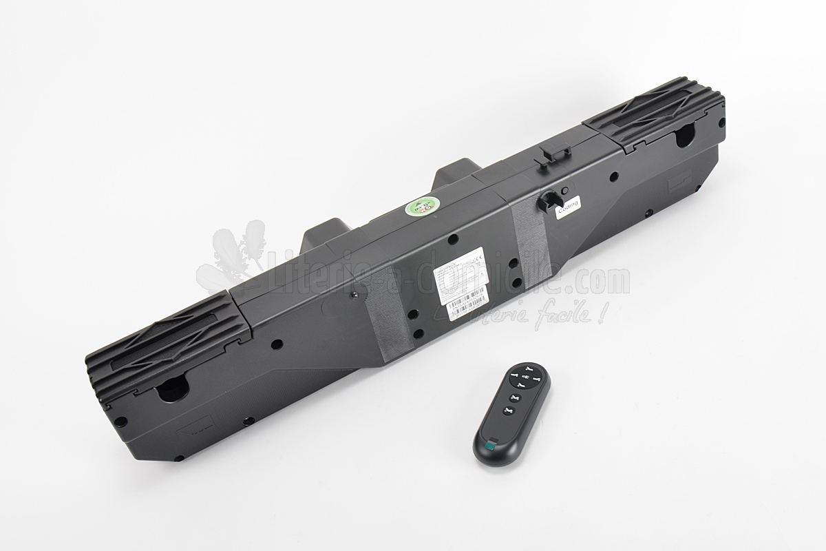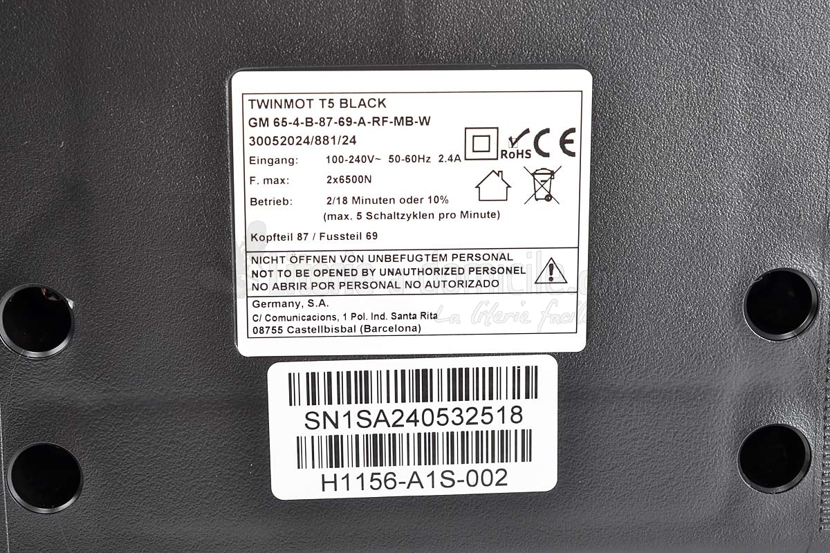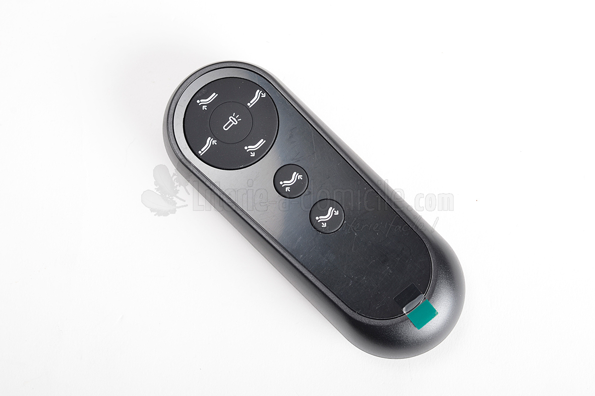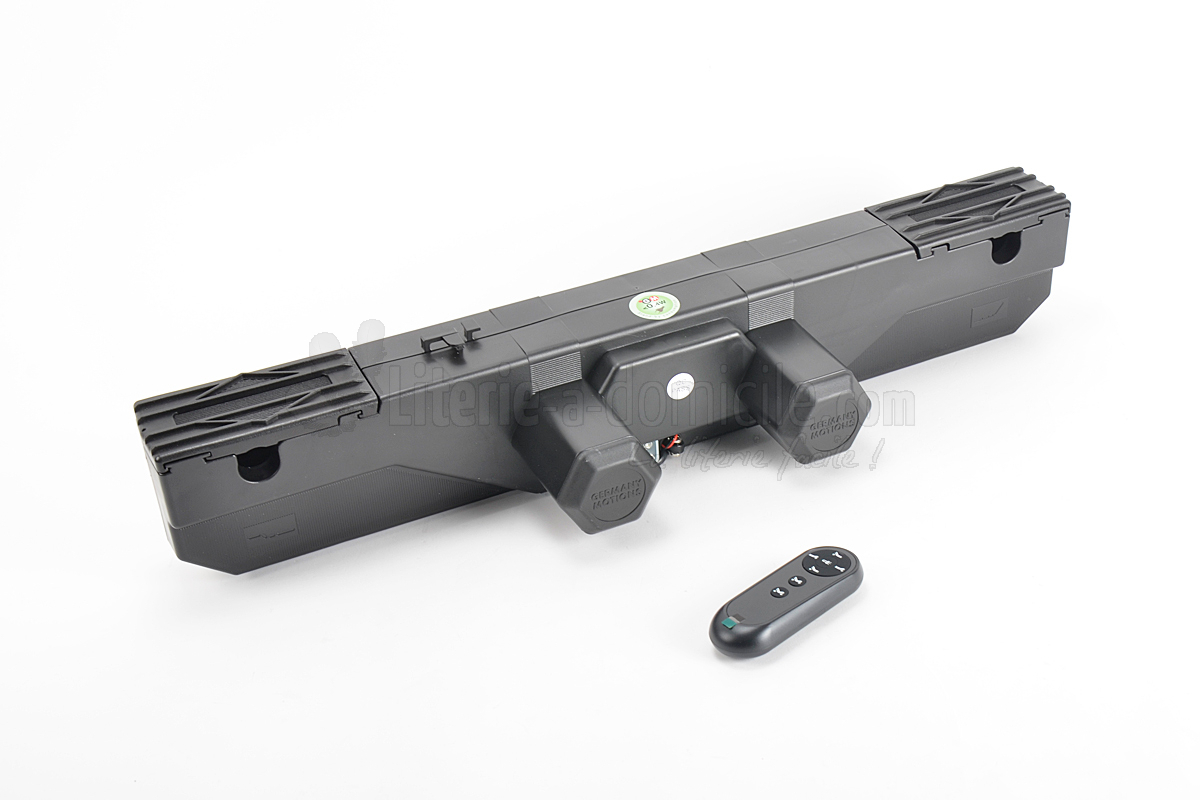 Le moteur de sommier relaxation électrique GERMANY MOTIONS T5 GM65-4-B-87-69-A-RF-MB-W est vendu avec sa télécommande RF noire.