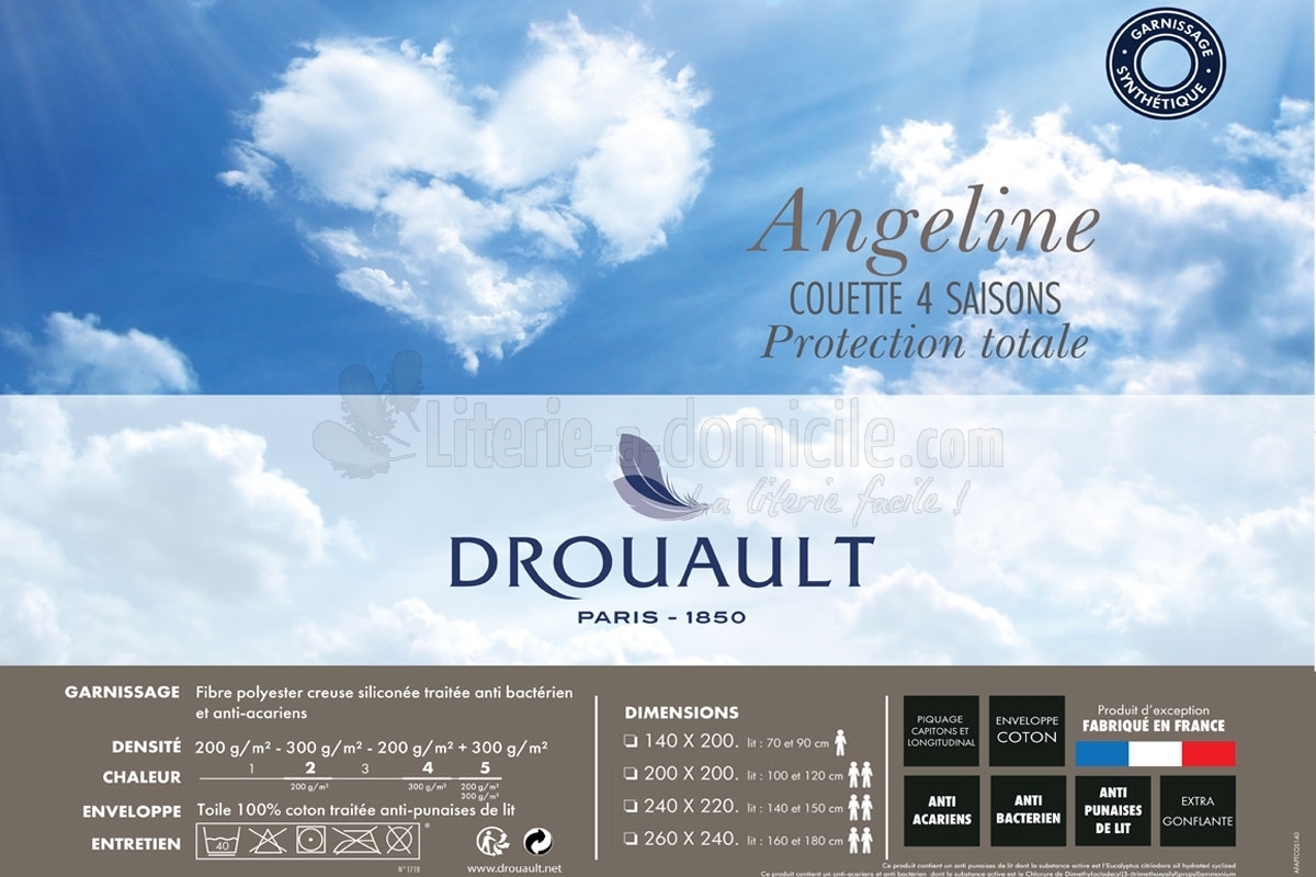 La couette synthétique ANGELINE v.2 répond à toutes vos exigences de durabilité et d'hygiène. Son garnissage anti-acarien et anti-bactérien, associé à une enveloppe traitée anti-punaises de lit vous assure une protection totale. La version 4 saisons est composée d'une couette ANGELINE été 200 g + une couette ANGELINE tempérée 300 g. Ces couettes sont jumelables par liens et restent utilisables indépendamment. Pratique pour recevoir la famille ou les amis !