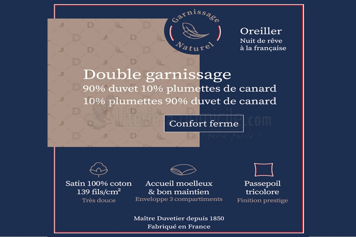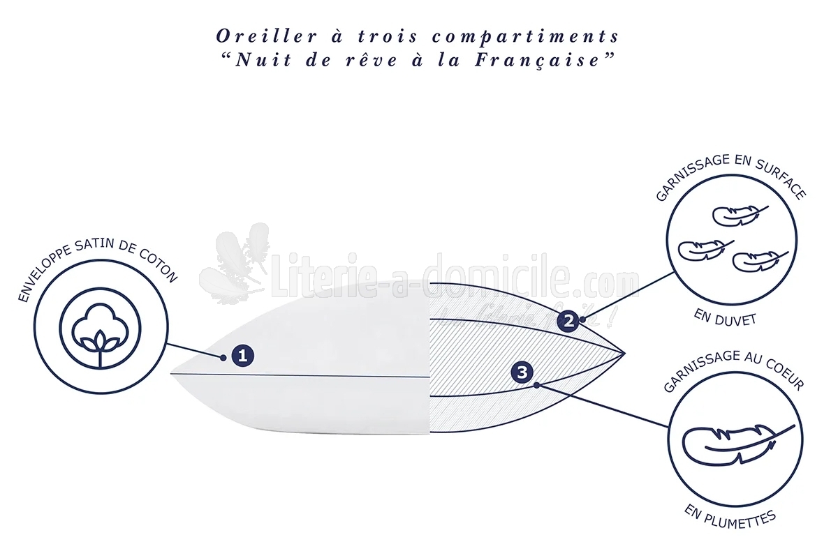 La confection de cet oreiller en 3 compartiments, permet de répartir le garnissage naturel (duvet et plumettes) de manière à favoriser un confort harmonieux et exceptionnel. Cet oreiller valorise la qualité et le savoir-faire français.