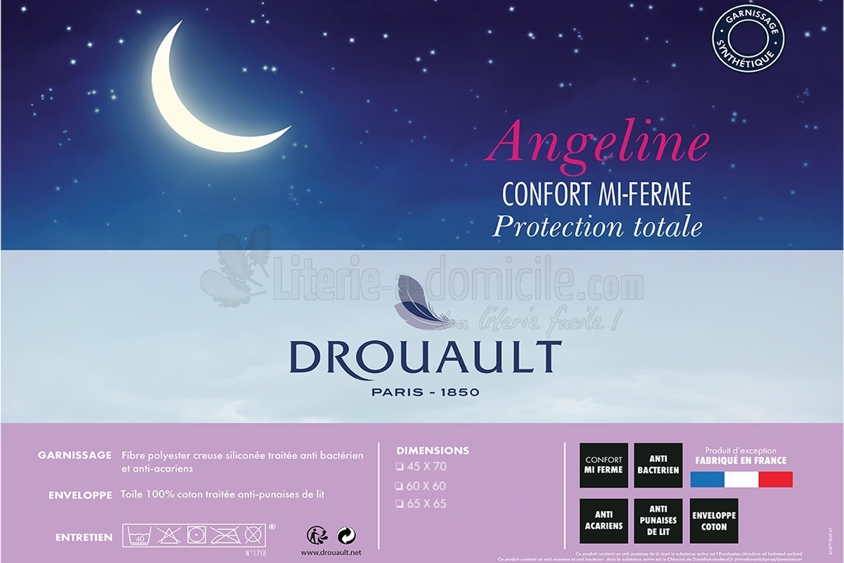 Confectionné avec 100 % de fibre polyester creuse siliconée, l'oreiller ANGELINE de DROUAULT offre un confort mi-ferme. Son enveloppe en 100 % coton donne une vraie douceur au toucher et les différents traitements (anti-acariens, anti-bactérien et anti punaises de lit) vous garantissent une protection totale.
