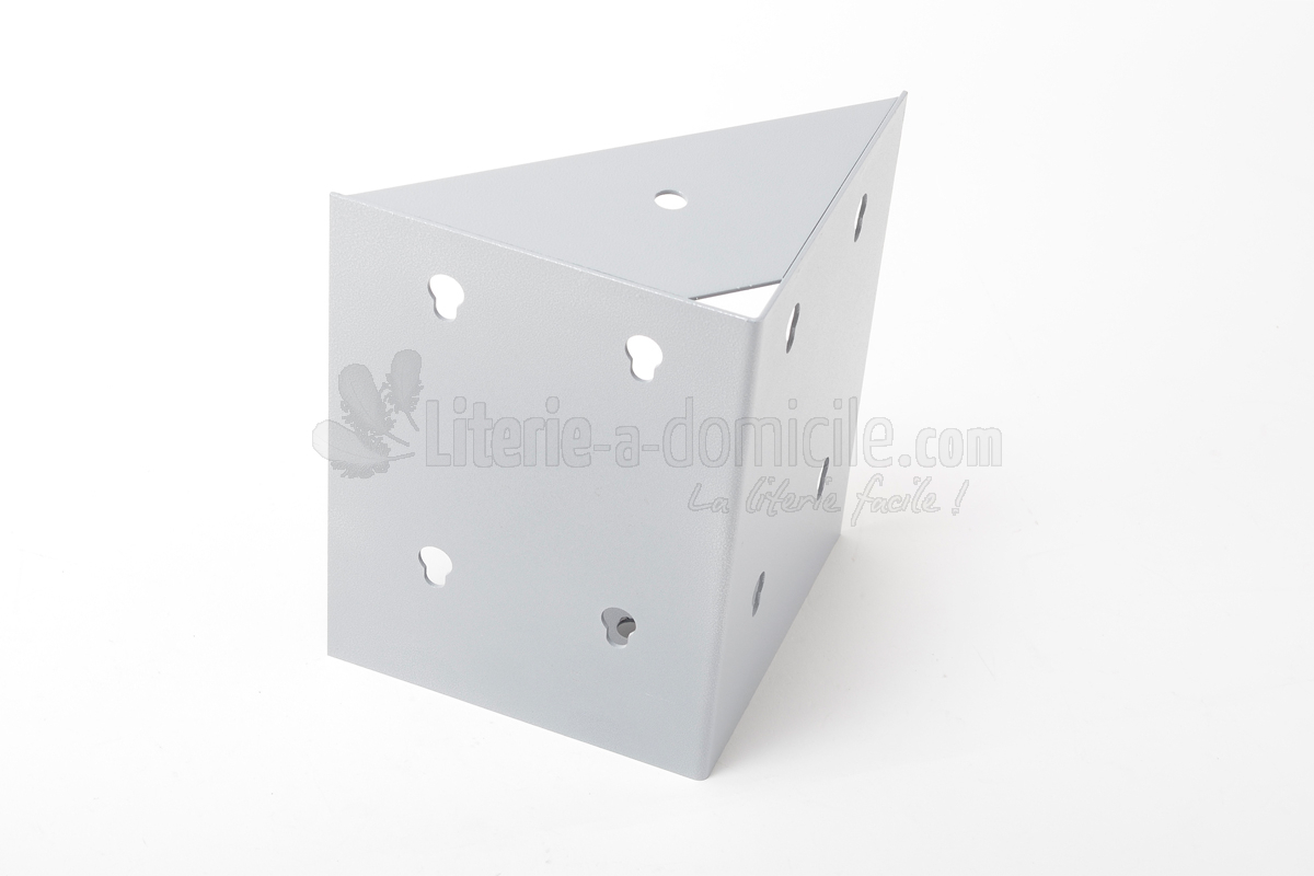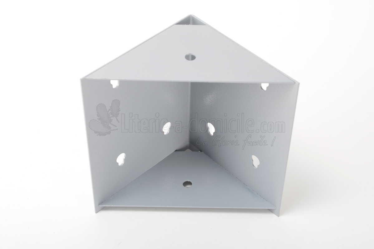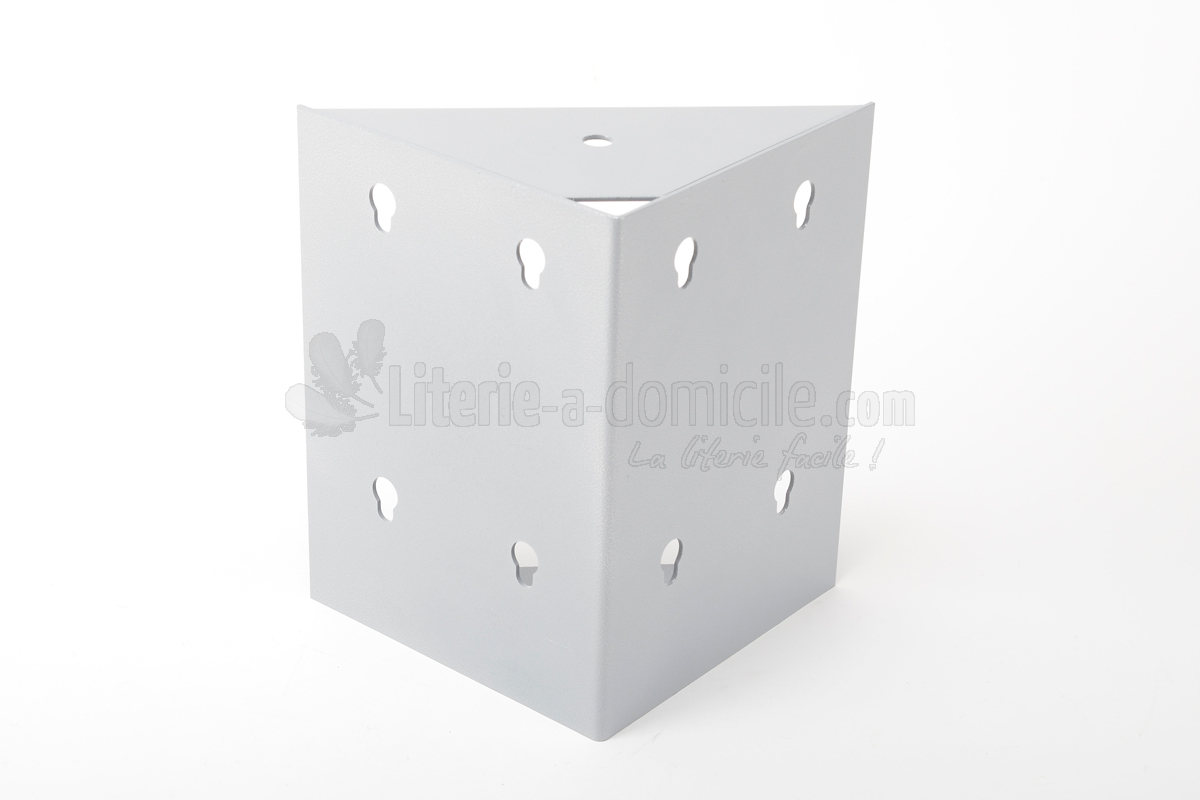 Cette MASSE D'ANGLE en acier laqué gris assure la jonction structurelle des 4 côtés d'un sommier ou d'un coffre de lit. Ses plateaux supérieurs et inférieurs offrent une base solide au cadre de lit et à la base du coffre. Pré-perçée, elle peut recevoir un pied de lit ou être fixée à la base du coffre.