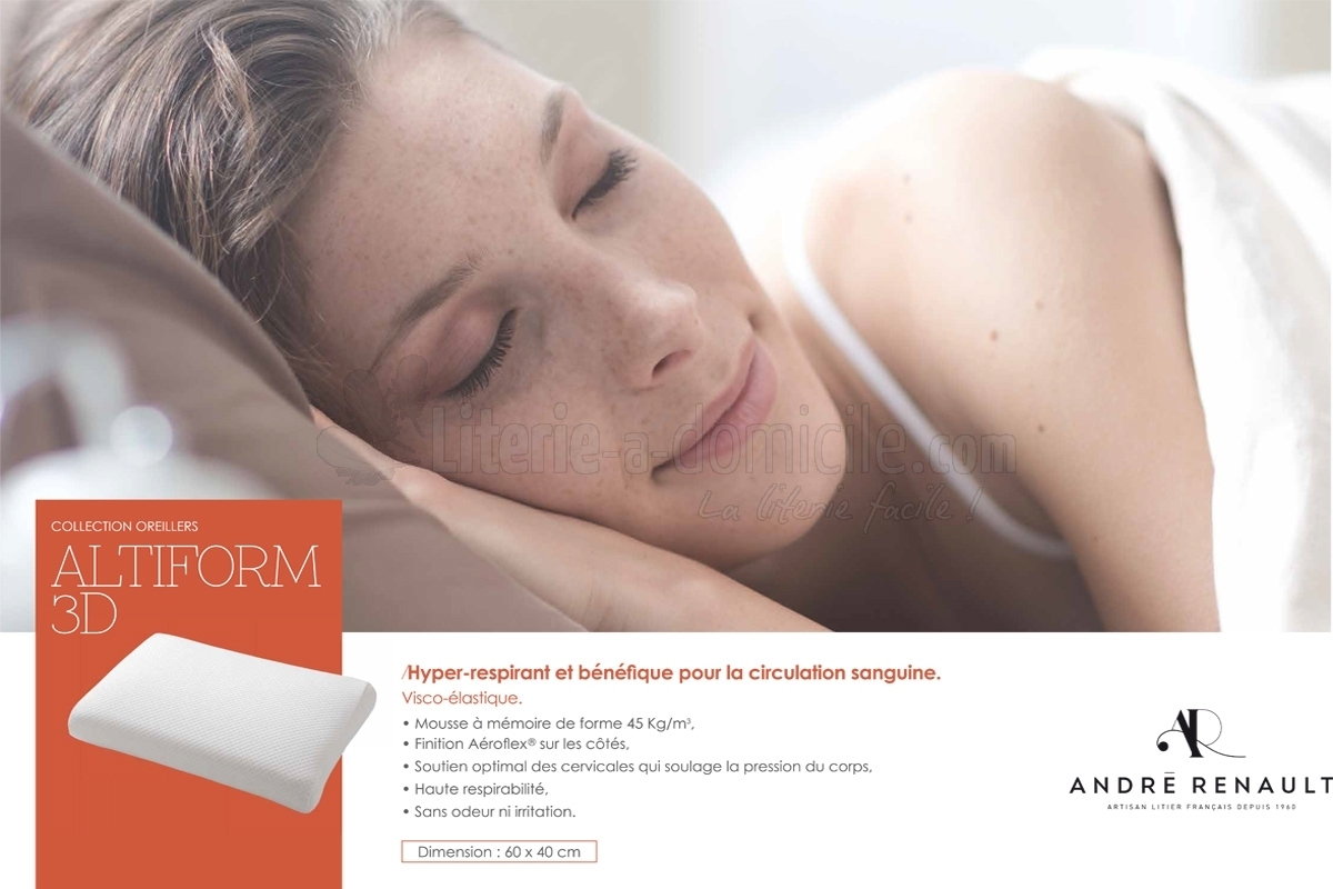 ANDRE RENAULT vous propose l'oreiller ALTIFORM en mousse visco élastique à mémoire de forme moelleuse, à la douceur incomparable.